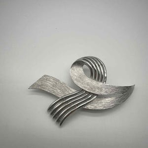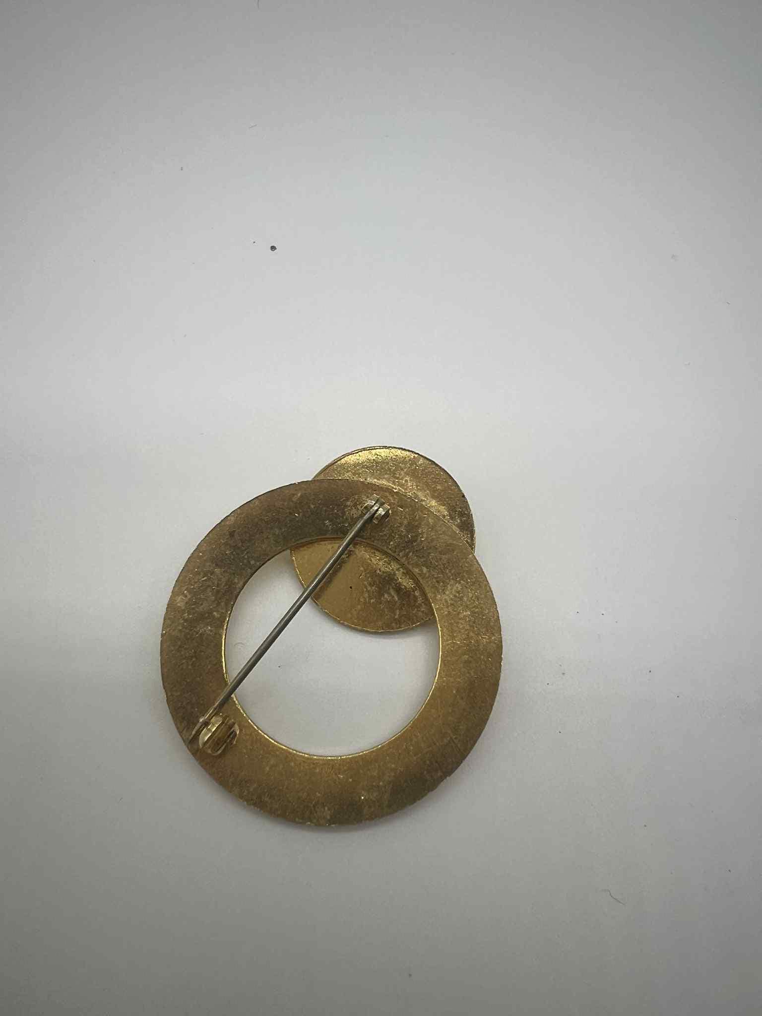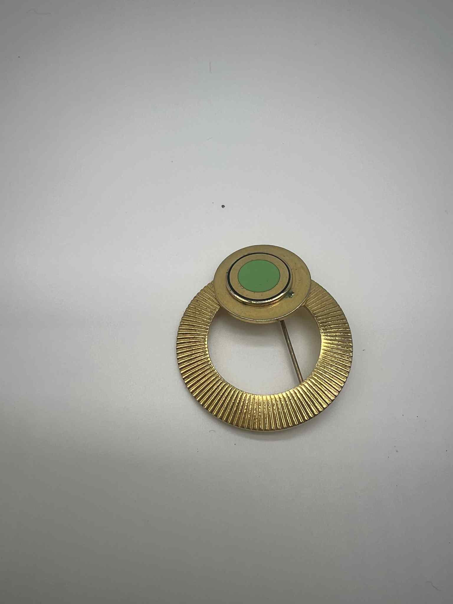 This vintage geometric brooch features a bold circular design with a textured ring and a smooth green enamel center. Its clean, modernist look adds a stylish touch to jackets, blazers, scarves, and dresses. Lightweight and eye-catching, it’s perfect for retro fashion lovers and collectors of unique costume jewelry.