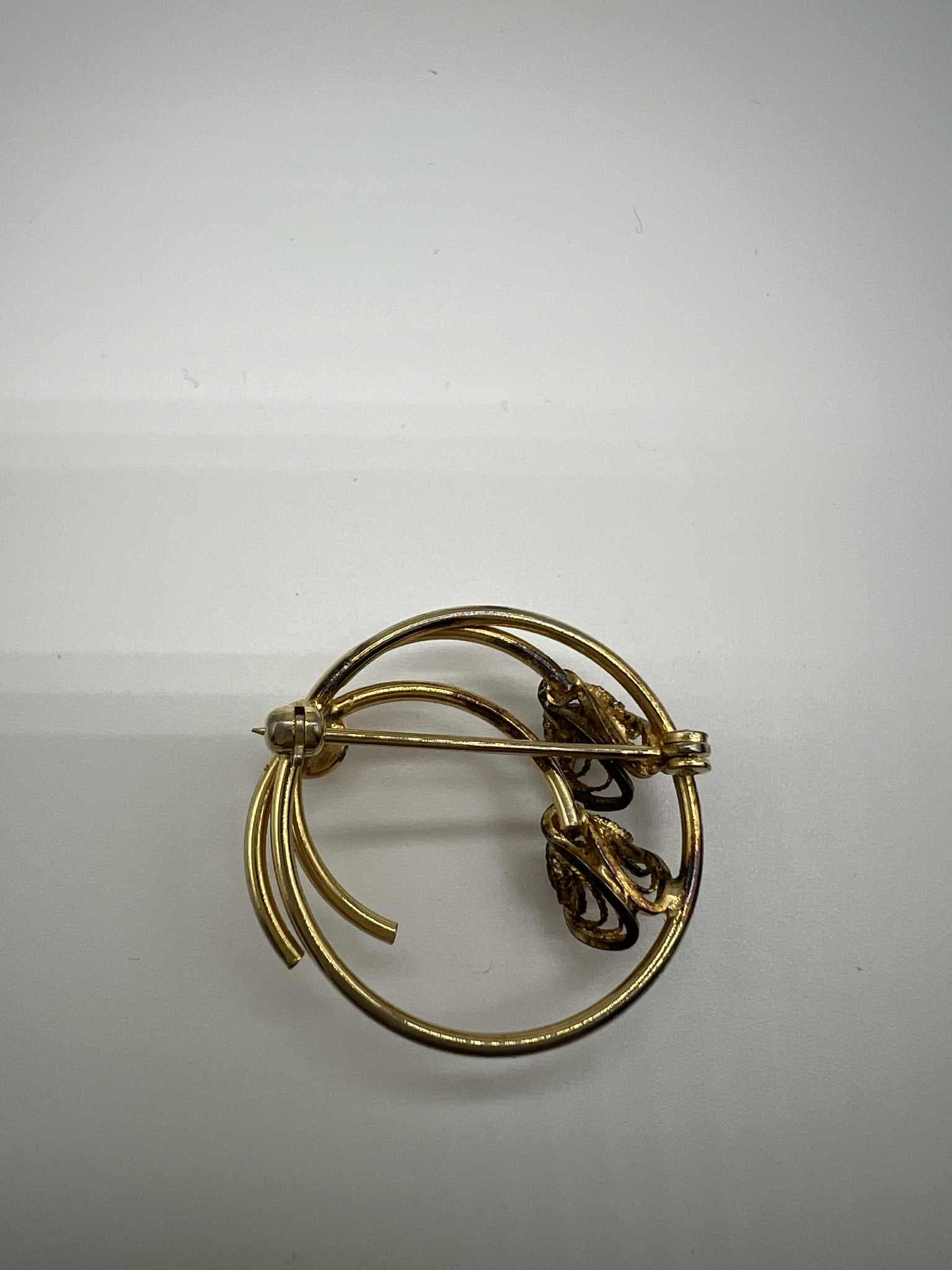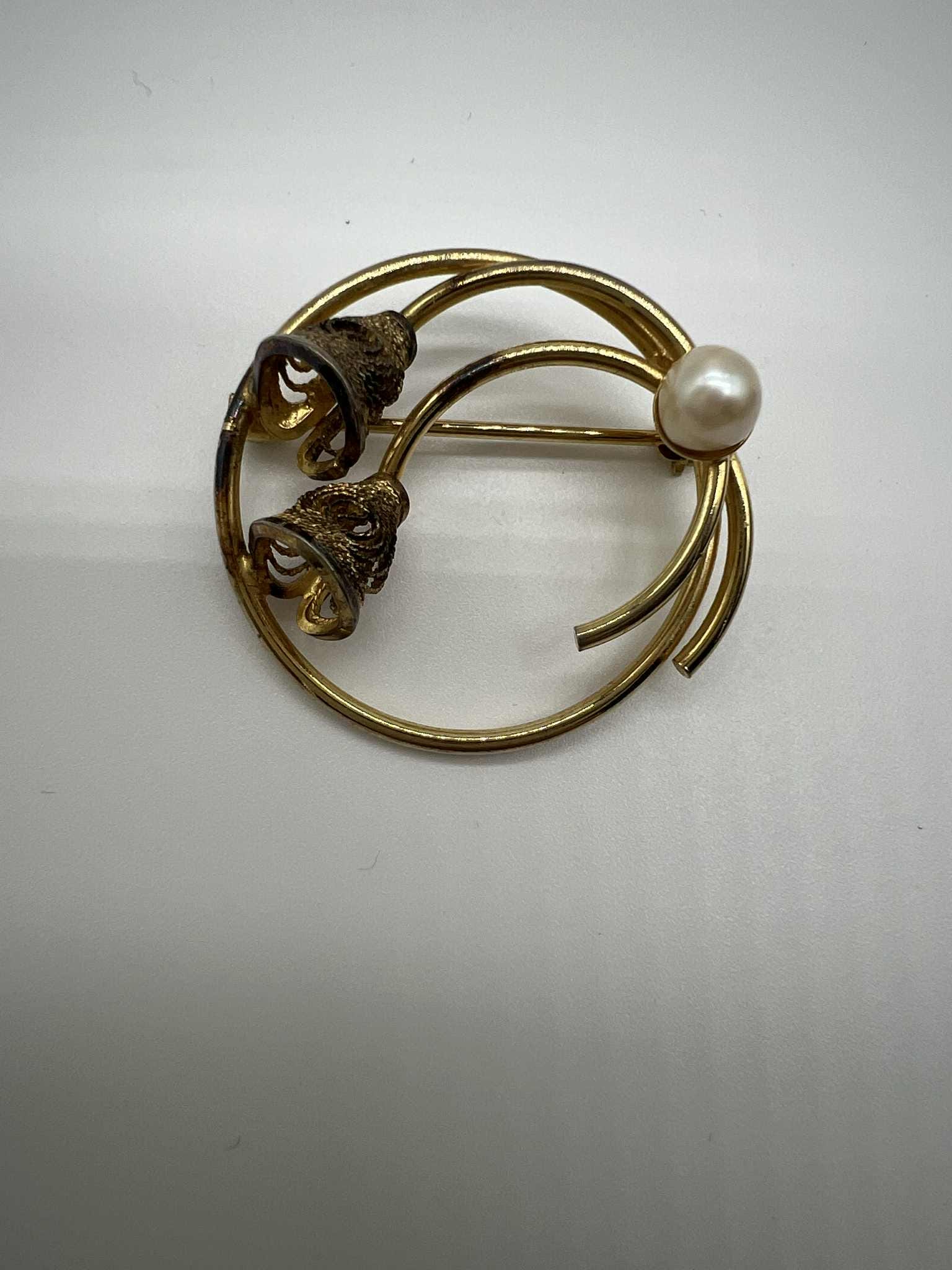 This vintage floral brooch features two textured flower buds set within an open circular frame, accented by a single faux pearl. Delicate and classic, it’s perfect for adding charm to jackets, scarves, blouses, or hats. A lovely piece for collectors and anyone who loves elegant, timeless costume jewelry.