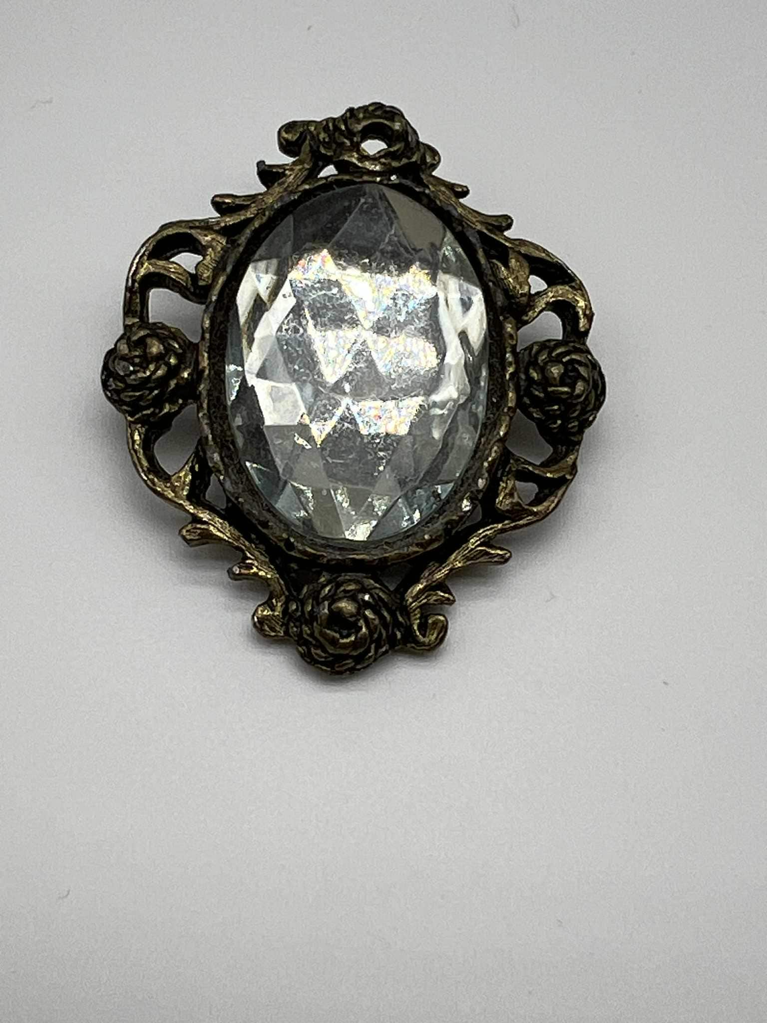 Vintage Gothic Oval Brooch, Large Faceted Glass Stone Pin, Antique Style Costume Jewelry