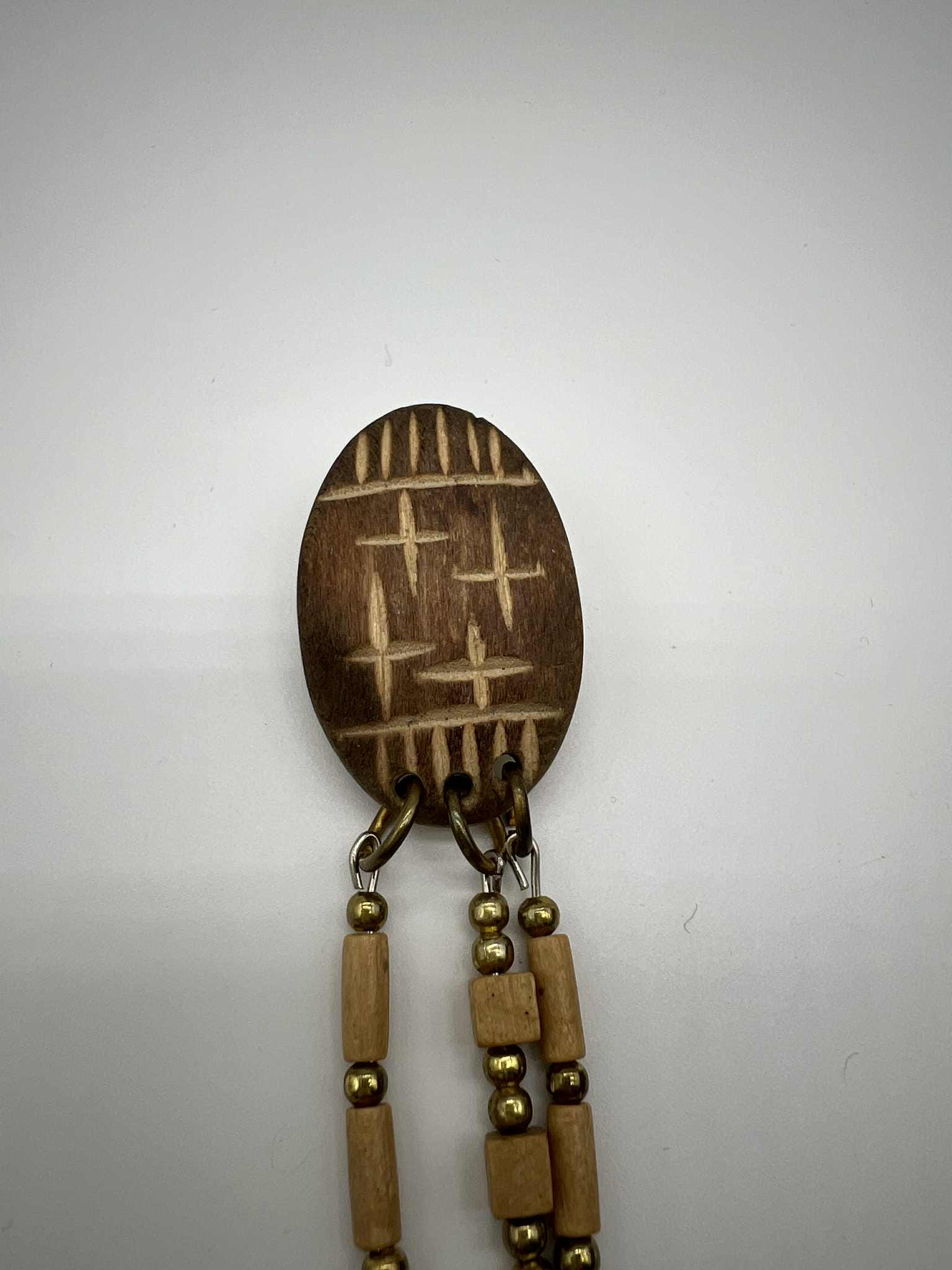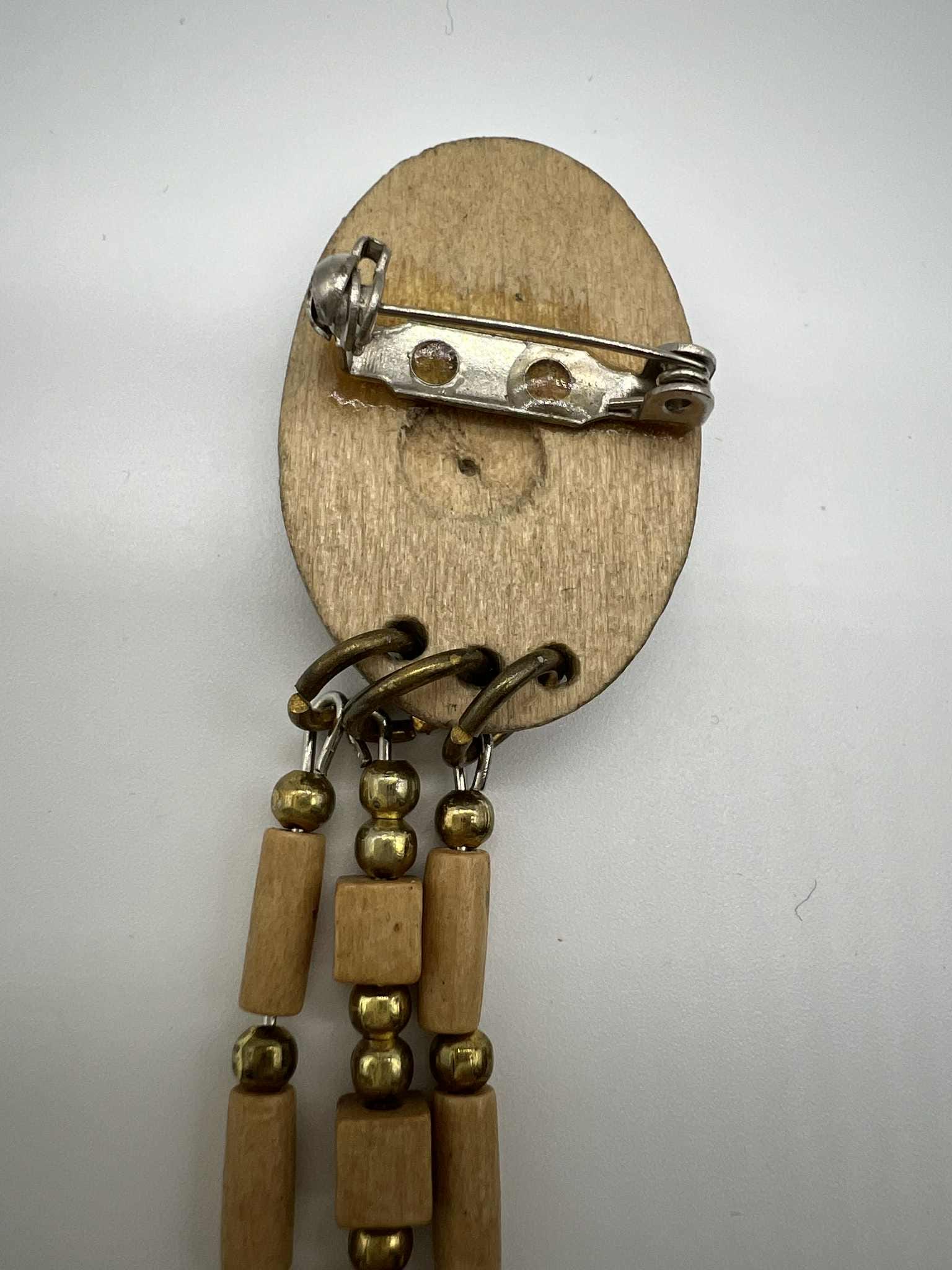 This rustic boho brooch features a hand-carved wooden oval pendant with tribal-style engraving and three dangle strands made of wood and metallic beads. Earthy and artistic, it’s perfect for casual outfits, natural fashion lovers, and anyone who enjoys unique handcrafted-style costume jewelry.