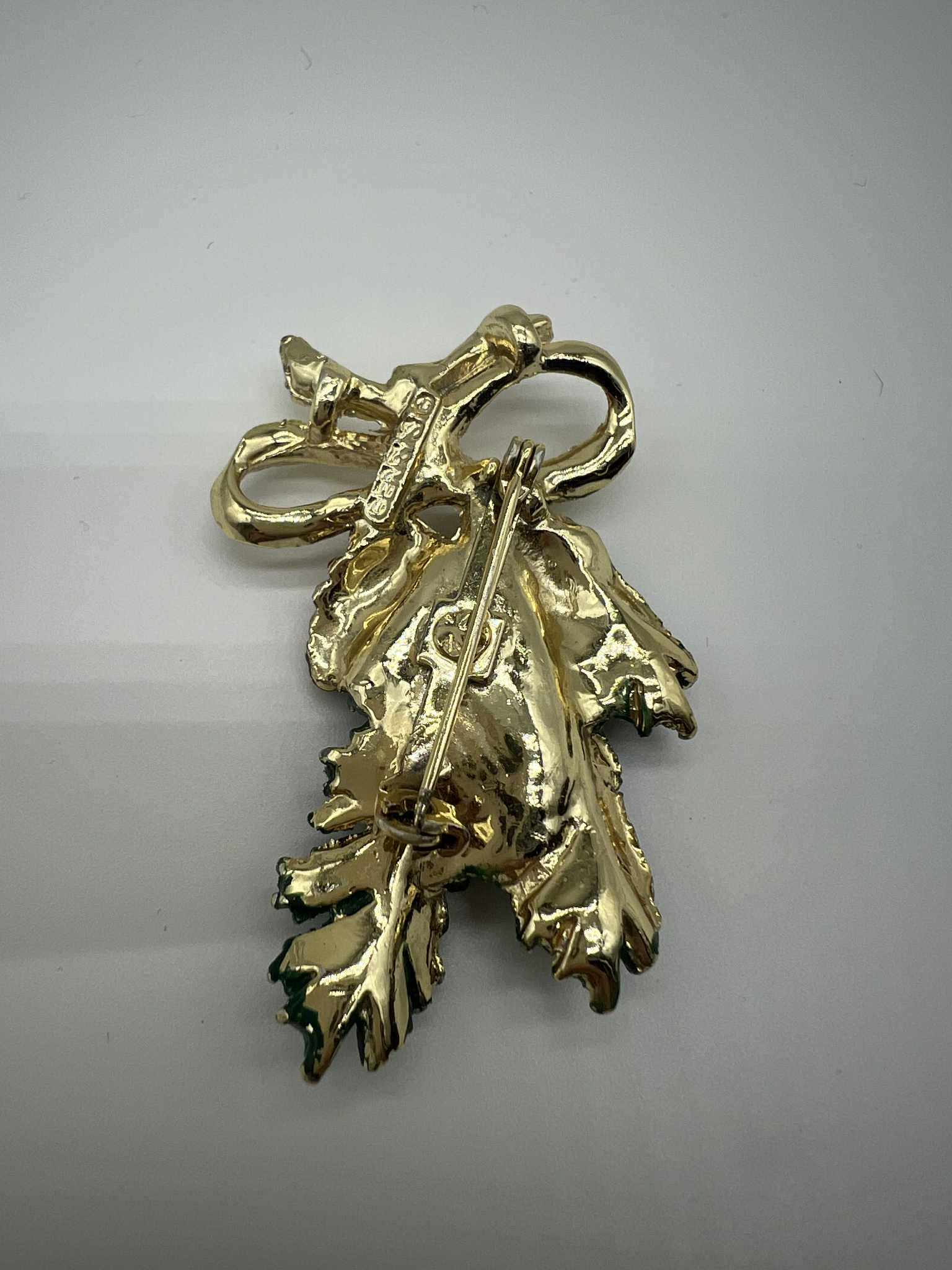 This charming vintage holiday brooch features two enamel pinecones accented with deep green evergreen leaves and a decorative bow. A classic festive accessory, perfect for adding seasonal warmth to sweaters, coats, scarves, or collecting Christmas-themed jewelry. Lightweight, detailed, and full of winter charm.